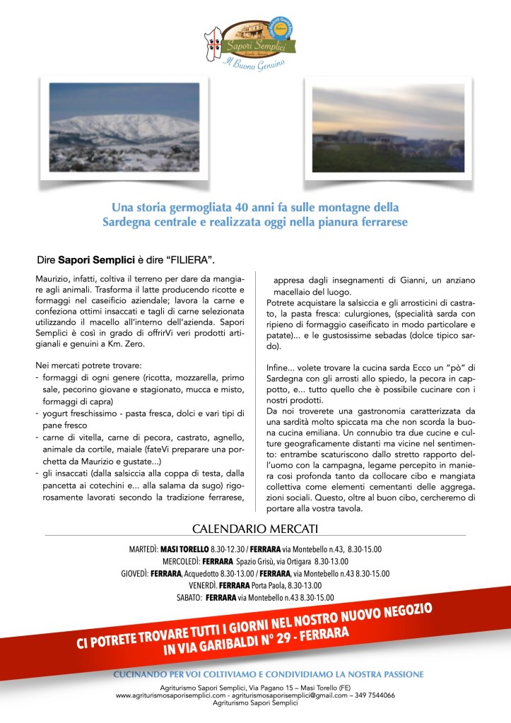 Agriturismo Sapori Semplici è nato – naturalmente a tavola- quando un gruppo di amici sardi ed emiliani, riuniti a cena a Masi Torello, in via Pagano n.15 – proprio nella cascina ristrutturata dove oggi sorge l’agriturismo – ascoltarono e condivisero l’idea che Maurizio perseguiva da tempo: quella di creare un luogo dove sperimentare l’incontro tra la cucina del suo luogo di nascita, la Sardegna, con quella della comunità che lo aveva accolto tanti anni fa, l’Emilia Romagna.